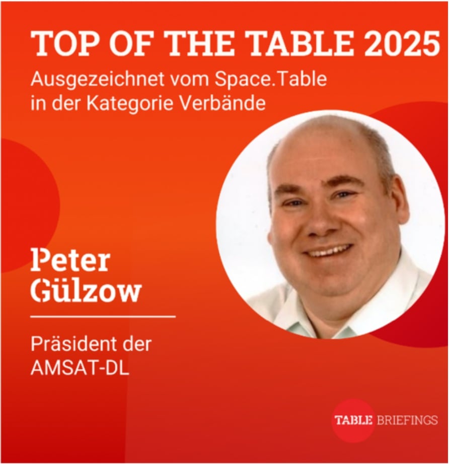 Peter Gülzow, DB2OS, was recently honored as one of the “Top 100 of the Table 2025/26”: The 100 key figures in the space scene, and among the ten most influential leaders in the associations category. This recognition was bestowed by by the editors of Space.Table. The Table.Briefings editorial team is a diverse group of talented editors who are experts in their field and bring a wide range of experience and knowledge.