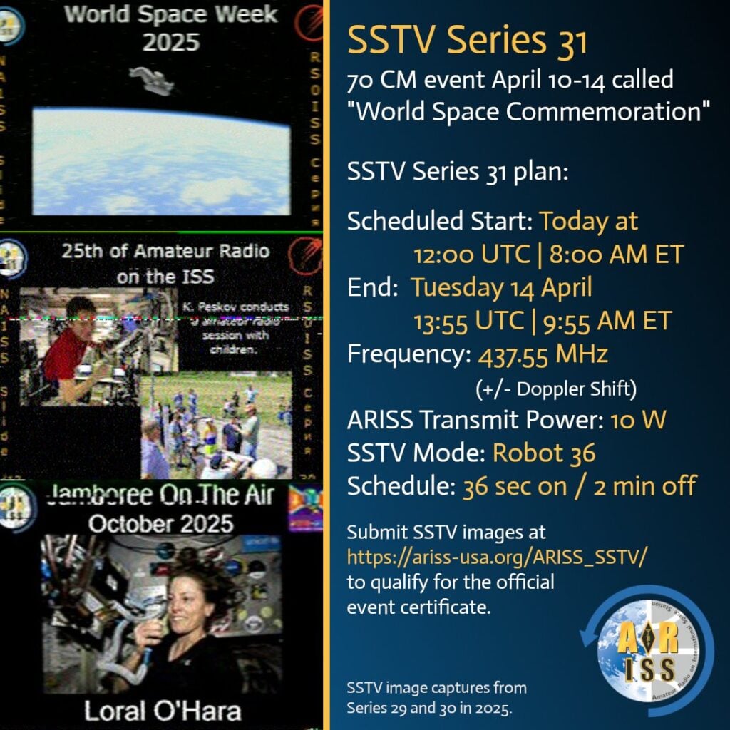 + ARISS SSTV Series 31 “World Space Commemoration” kicked off on April 10, 2026, on 437.550 MHz FM using Robot 36 mode. Transmissions run through April 14 and feature images honoring Cosmonautics Day, the 100th anniversary of liquid-fueled rockets, the first Space Shuttle launch, and SuitSat. Operators worldwide are actively tracking passes and sharing receptions.