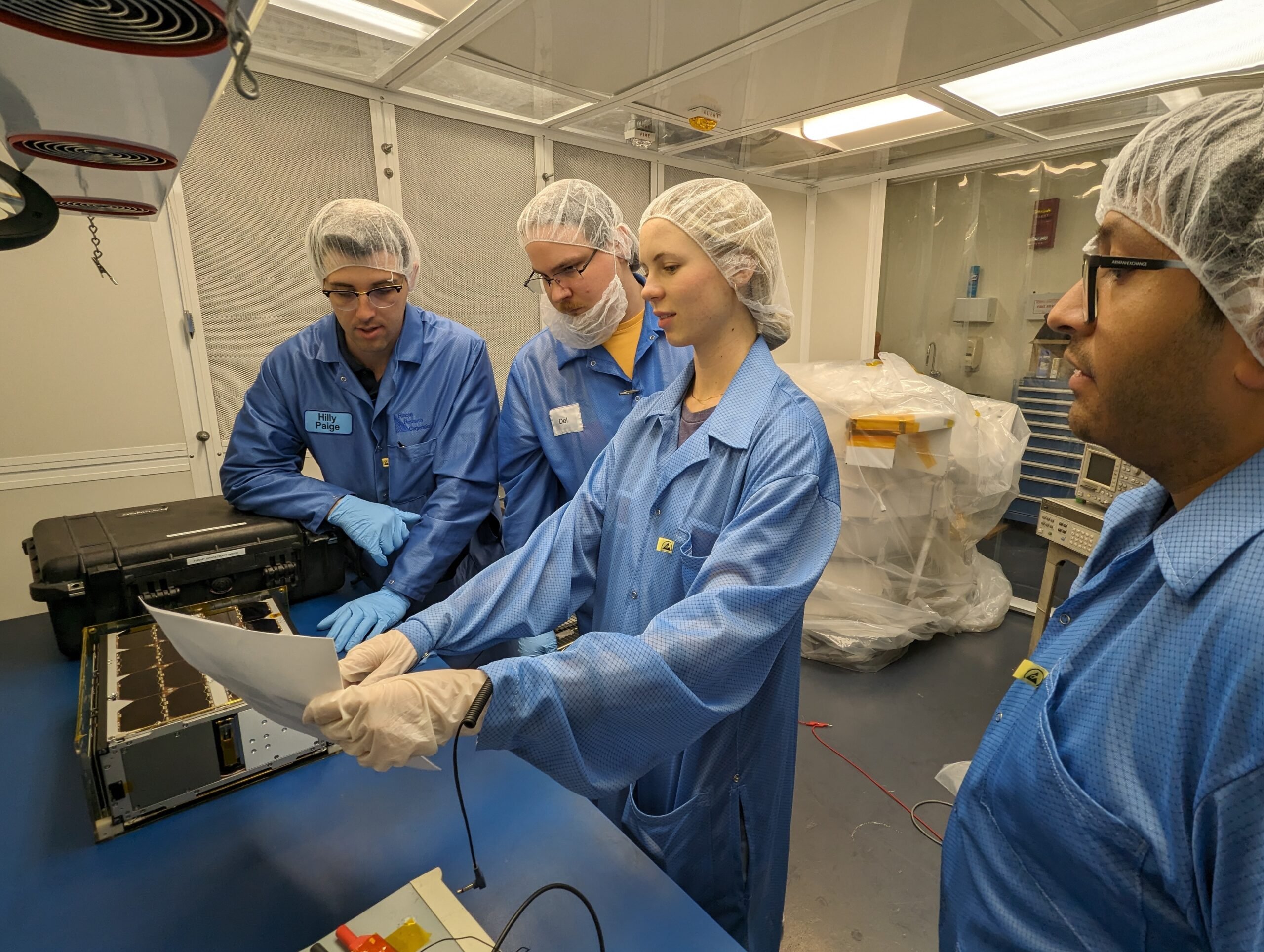 CatSat team members assemble and inspect the student-built spacecraft ahead of its July 2024 launch. [Credit: The University of Arizona]