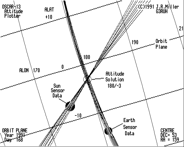 ECLIPSE calculates the time and duration of eclipses by the Sun, and is used to determine when temporary changes to the transponder schedule have to be made. MOONECL does the same thing for the Moon. SMOOTH13 takes many sets of Norad keplerian element sets and smooths them, resulting in a secondary set of elements that is free of the short term luni-solar variations and measurement noise that is so readily apparent [5]. About 6 month's past data, typically 20 sets, is processed at once. The smoothed set is used by all the management programs, rendering them consistent and accurate. The set is also converted into Oscar-13's on-board computer format for direct uploading.