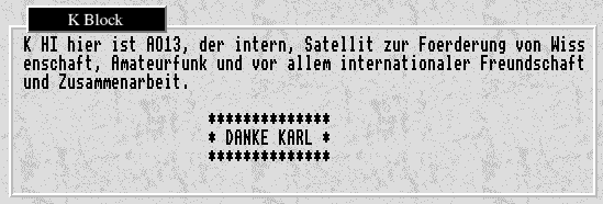 Figure 1. Oscar-13's first beacon message: "HI, this is AO13, the international spacecraft to support science/education, amateur space communication and above all international goodwill and cooperation".